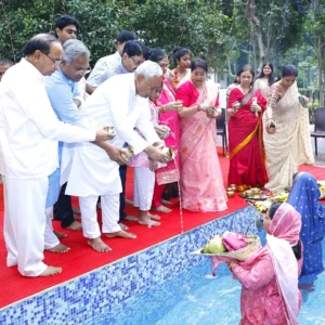 मुख्यमंत्री नीतीश कुमार ने अस्ताचलगामी भगवान भास्कर को अर्घ्य अर्पित किया