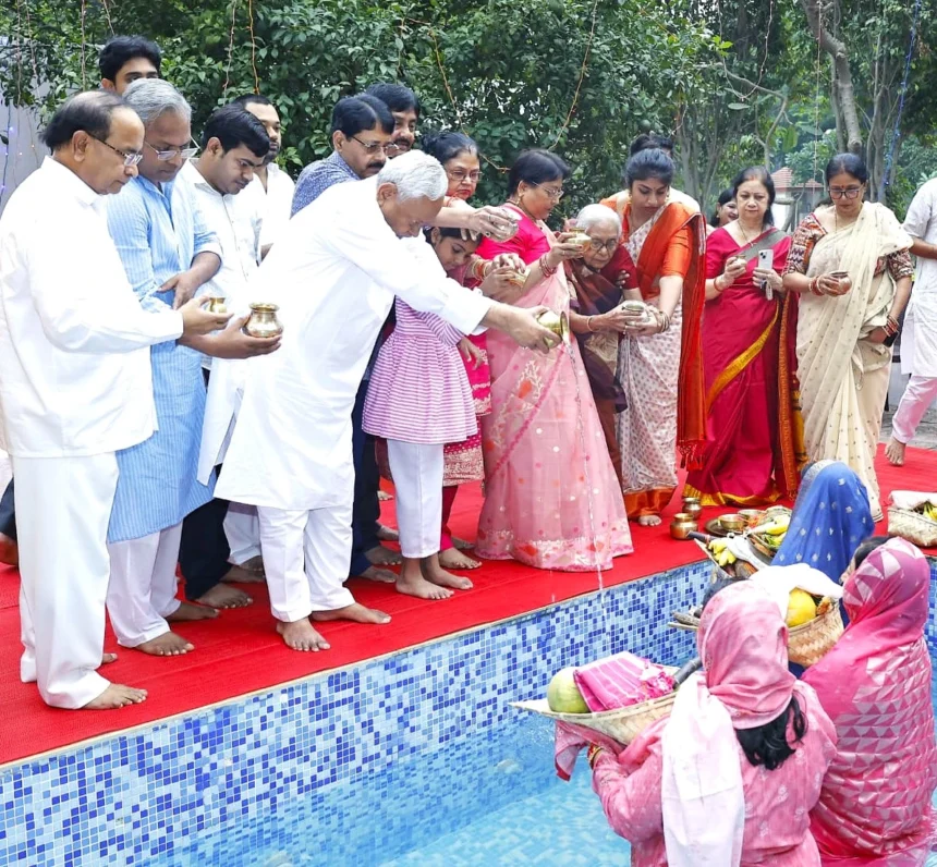 मुख्यमंत्री नीतीश कुमार ने अस्ताचलगामी भगवान भास्कर को अर्घ्य अर्पित किया